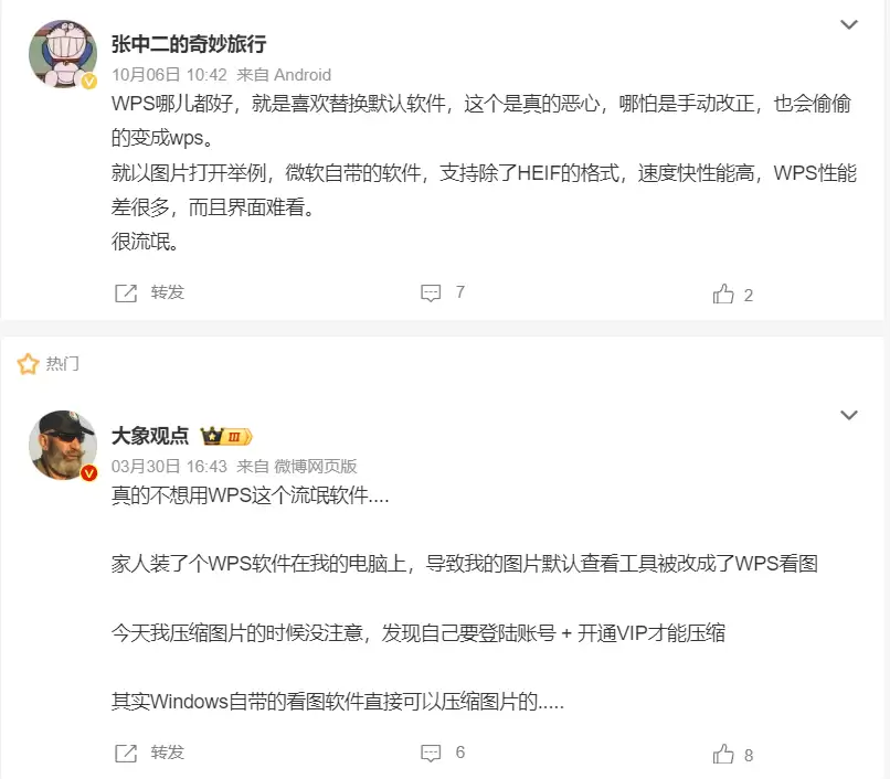 最近一段时间,不少网友在社交平台上纷纷对金山软件旗下的WPS产品提出了诸多意见。有用户反映,WPS看图工具启动速度缓慢,严重影响了日常办公的效率。虽然WPS作为日常必备工具难以完全弃用,但其默认强制关联图片查看的行为实在令人困扰,即使手动修改文件打开方式,重启后又会恢复默认设置。