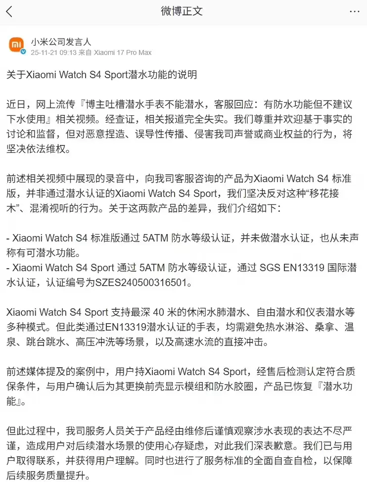 11月21日,小米公司发言人发布《关于Xiaomi Watch S4 Sport潜水功能的说明》,回应了近期网络热议的"博主吐槽潜水手表不能潜水,客服回应:有防水功能但不建议下水使用"一事。