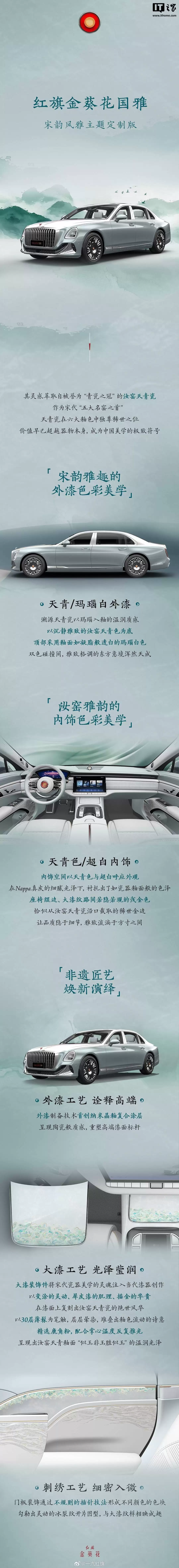 一汽红旗最新推出的金葵花国雅“宋韵风雅主题定制版”,将宋代汝窑天青瓷的美学精髓融入设计理念,让传统美学与现代造车工艺完美融合,打造出独具东方韵味的豪华座驾。