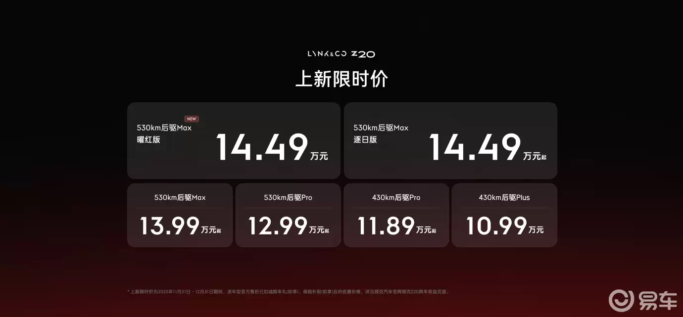 2025广州车展上,领克Z20家族迎来新成员——"智趣驾享纯电SUV"领克Z20+ 530km后驱Max曜红版(简称"曜红版")正式发布,限时售价14.49万元。即日起,消费者可通过领克官方APP订购新车,享受购车礼、金融礼、焕新礼等多重福利。在2025年11月21日至12月31日期间成功锁单并提车的前200名用户,还将获赠价值666元的"LYNK & CO Z20 × 不合作Nidea·Nlight联名氛围灯,为精致出行增添独特仪式感。