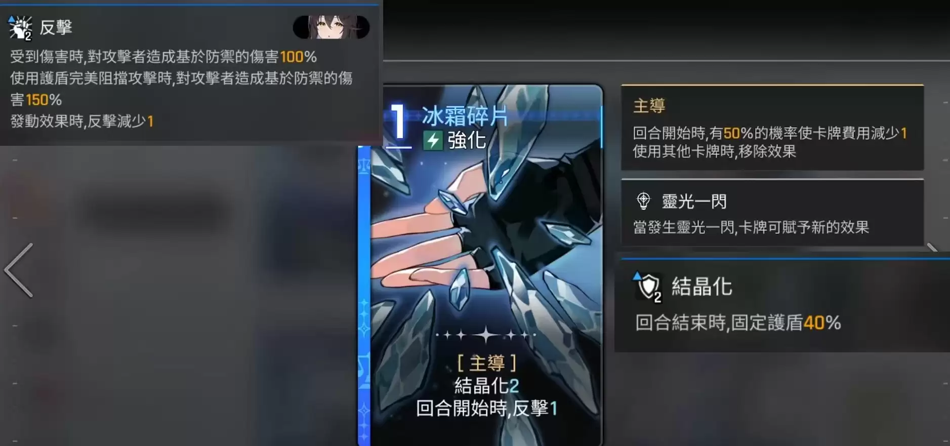 其首张专属卡「冰霜碎片」是张费用为1的强化类卡牌,具备结晶化2的效果,在回合开始时提供一次反击机会。其中「结晶化」机制指的是在每回合结束时,根据当前累积的层数转化为固定数值的护盾值,有效增强持续生存能力。第二张独特卡「冰河铁拳」,可造成相当于防御力150%的单体伤害,并额外获得等同于本次伤害量50%的固定护盾。需要特别注意的是,若部分伤害被敌方护盾吸收,则这部分不会计入护盾生成的基数。