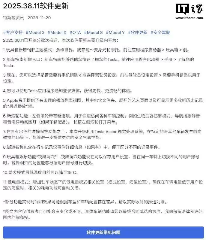 特斯拉中国近日面向Model 3、Model Y、Model S及Model X全系车型,正式启动2025.38.11版本软件的分批推送。本次更新涵盖了驾驶安全、娱乐交互、车辆控制等十余项功能升级,为用户带来更智能化的用车体验。