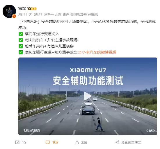 小米汽车近日宣布,其自主研发的AES紧急转向辅助功能在多项复杂场景测试中取得了显著进展。该系统针对城市道路高频风险场景开展专项优化,顺利通过摩托车逆行切入、多车连环碰撞现场、儿童横穿马路及前方事故车避让等四大核心测试项目。