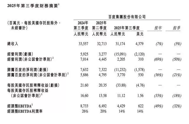 百度集团(9888.HK)近日公布的2025年第三季度财报显示,公司意外出现净亏损,引发市场广泛关注。财报数据显示,今年前三季度集团总收入达963.4亿元,较去年同期下滑2.69%,净利润为37.6亿元。业绩下滑的主要原因在于第三季度表现疲软,该季度总收入仅为311.74亿元,同比减少7%,创下季度收入最大跌幅纪录。在剔除资产减值等因素后,第三季度净亏损高达112.32亿元,而去年同期净利润为76.32亿元。