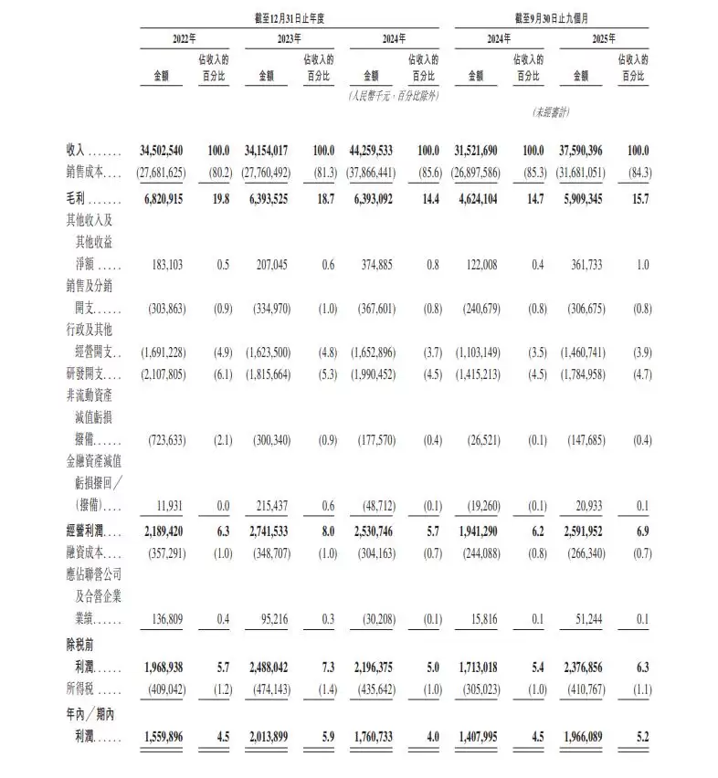 从业绩表现来看,招股书显示,2024年、2024年、2024年及2025年前九个月,领益智造营收分别为345.03亿元、341.54亿元、442.60亿元及375.90亿元;同期毛利率分别为19.8%、18.7%、14.4%及15.7%;期内利润分别为15.60亿元、20.14亿元、17.61亿元及19.66亿元。