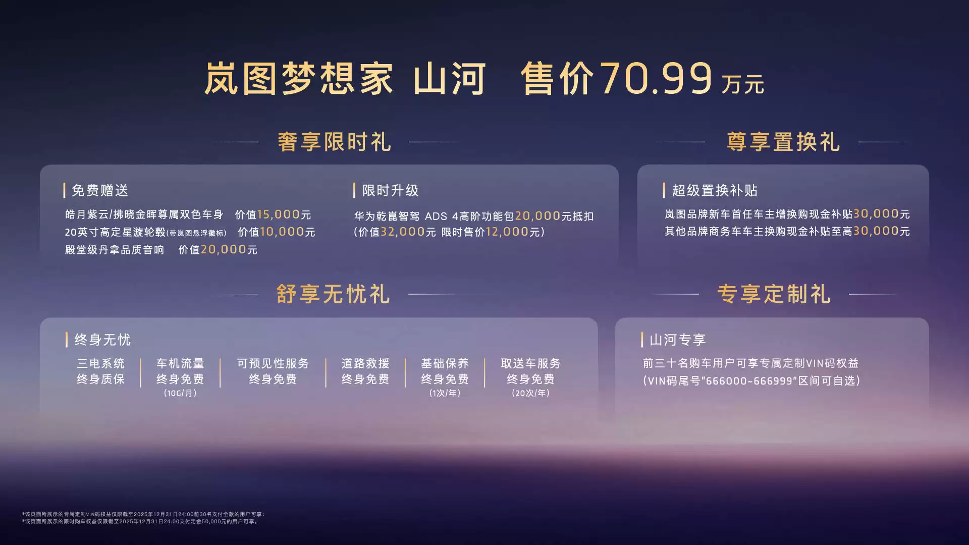 在广州车展的璀璨舞台上,一款备受瞩目的“新时代旗舰四座MPV”——岚图梦想家山河正式揭开神秘面纱,以70.99万元的售价震撼上市,同步推出的山河专属四重礼,更是为这款新车增添了无限魅力。专属礼包含皓月紫云/拂晓金辉尊属双色车身、20英寸高定星漩轮毂(带岚图悬浮徽标)、殿堂级丹拿品质音响,还有华为乾崑智驾ADS 4高阶功能包现金抵扣、超级置换补贴、专属定制VIN码权益,以及三电系统终身质保、车机流量终身免费、道路救援终身免费等丰富权益,让消费者感受到满满的诚意。
