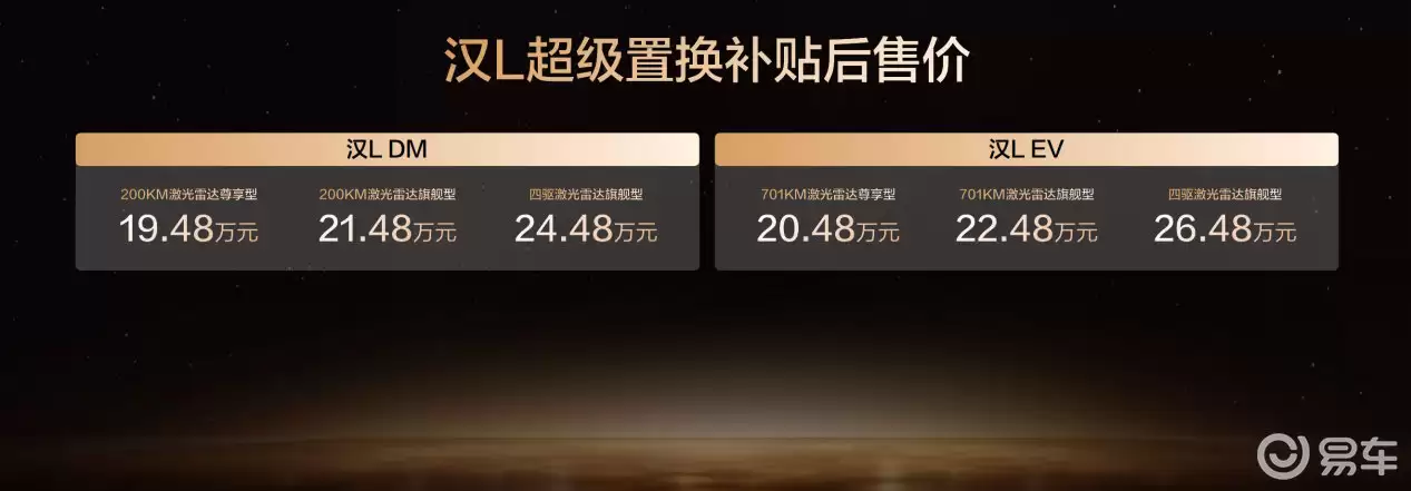 价格体系方面,汉L EV推出三款车型,补贴后售价区间为20.48万-26.48万元;DM版本三款车型售价19.48万-24.48万元。即日起至12月31日,购车用户可享最高5.2万元尊享礼遇,包括价值13000元的外观套装(含特色车色、运动套件等)限时5000元选购权,以及最高15000元的置换补贴。比亚迪联合好孩子、倍轻松等品牌推出智能儿童安全座椅、颈部按摩仪等生态周边产品,进一步丰富用车场景体验。