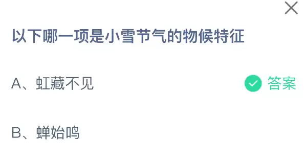 如何判断小雪节气的典型物候特征?支付宝小鸡课堂开课啦!每天只需花一分钟答题,喂喂小鸡就能轻松献爱心,既有趣又有意义!2025年11月22日蚂蚁庄园今日题目正确答案是【虹藏不见】。