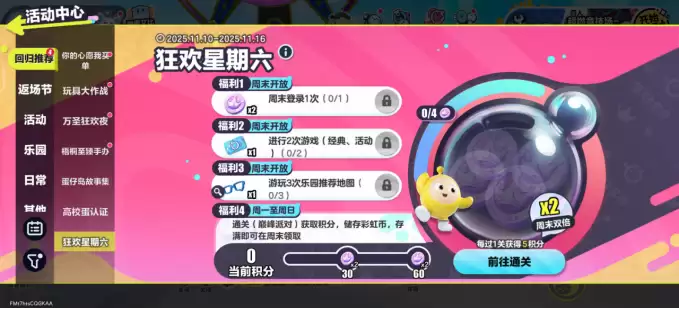 进入蛋仔派对主界面后,我们能在顶部发现活动按钮,点击即可进入活动中心。这里汇集了各种精彩活动,比如玩具大作战、万圣狂欢夜,还有心愿我买单等趣味玩法,更有众多返场环节等待探索。在活动中心的回归推荐栏最下方,就能找到"疯狂星期六"入口,点击进入活动页面,开启闯关之旅。在周末完成两次指定游戏模式,无论是经典玩法还是活动专属模式,都能领取惊喜福利。
