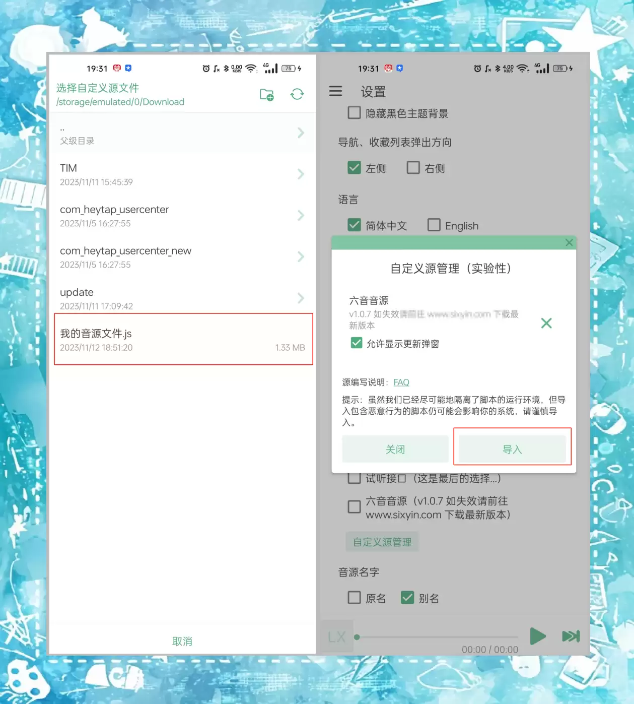 要在洛雪音乐app中导入音源,首先进入文件管理器,找到音源文件的存储路径并选择导入。操作完成后,您就能轻松将这些音源添加到洛雪音乐中。接下来只需勾选刚才导入的音源文件,洛雪音乐便会自动识别并调用这些资源。