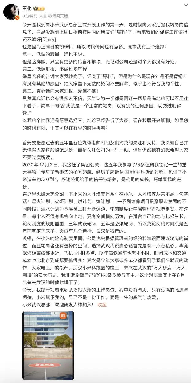 小米王化转岗武汉总部:内部调职,开启新阶段