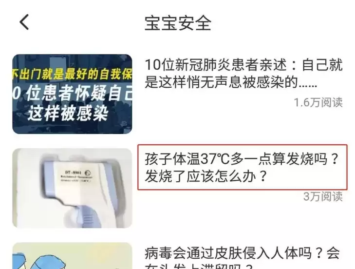 "宝宝安全"板块主要提供关于儿童常见疾病的预防知识和应对建议。我们选择第二篇文章《孩子体温37℃算发烧吗?发烧了应该怎么办?》,点击进入阅读;
