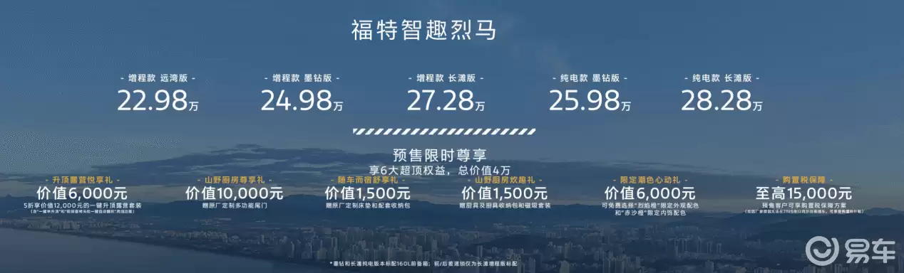 智驭烈马延续了福特烈马系列的经典设计语言,基于福特原生智能新能源架构打造,提供纯电与增程两种动力版本。车身长度突破5米,轴距接近3米,宽适的内部空间既满足日常通勤需求,又能从容应对长途出行。纯电车型配备105.4度电池组,续航里程可达650公里;增程版本综合续航更超过1200公里,纯电模式下最长可行驶220公里,有效缓解了用户的里程焦虑。