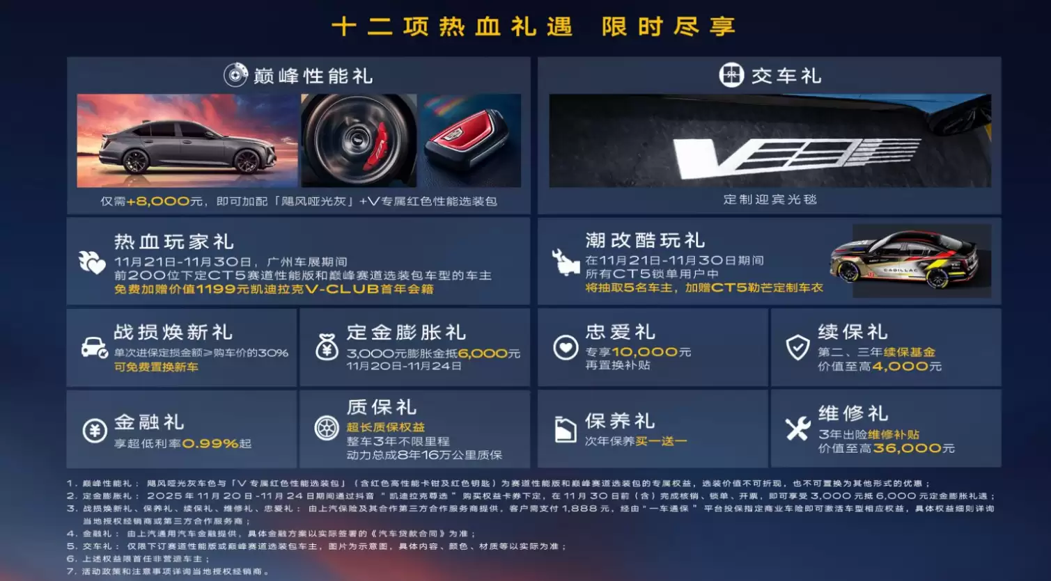 为降低消费者购车门槛,凯迪拉克推出多项限时权益。用户可享受12重豪礼,包括8000元解锁价值1.8万元装备的巅峰性能礼、3000元抵6000元的定金膨胀礼,以及免费赠送V-CLUB会籍的热血玩家礼。最引人注目的是行业首创的“战损焕新礼”:若车辆单次定损超30%,用户可免费置换等价新车,彻底解决后顾之忧。