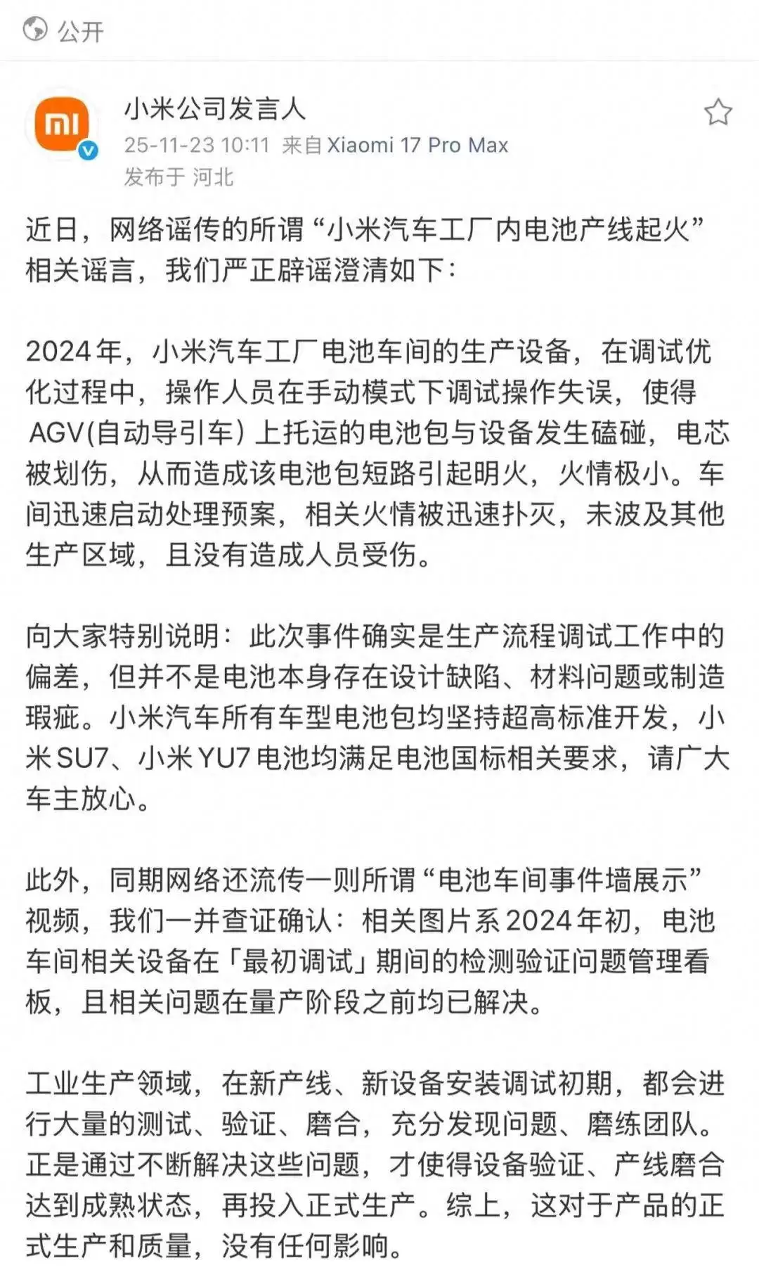 关于近期网络上流传的“小米汽车工厂电池产线起火”不实信息,小米公司通过官方渠道发布正式声明,详细说明了事件经过与调查结果。根据核实,此次事故源于生产设备调试期间的操作失误,与电池本身质量无关,事件未对后续生产线造成任何影响。
