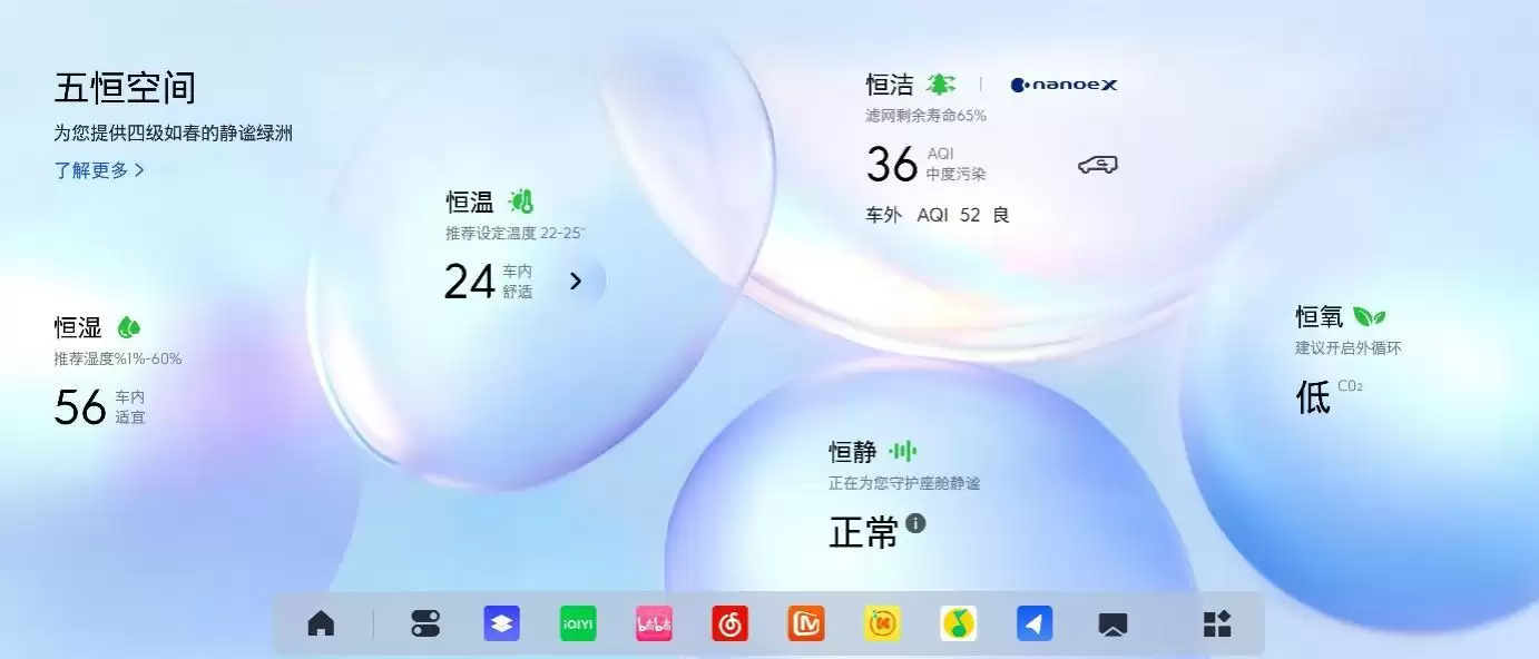 在家庭健康关怀方面,至境世家打造了行业首个"五恒"大健康座舱。恒温系统通过双层流空调实现分区控温,上层输送新风,下层调节温度;恒湿功能将车内湿度稳定在40%-60%的舒适区间;恒氧系统配合主动换气技术,可降低车内CO₂浓度,让长途乘车不易犯困。尤为值得一提的是恒洁配置,采用松下nanoe™X技术,每秒释放4.8万亿羟基自由基,搭配抗过敏滤网,形成从阻隔到净化的全链条防护。座椅皮革通过OEKO-TEX婴儿级认证,充分考虑到有老人和小孩的家庭出行需求。