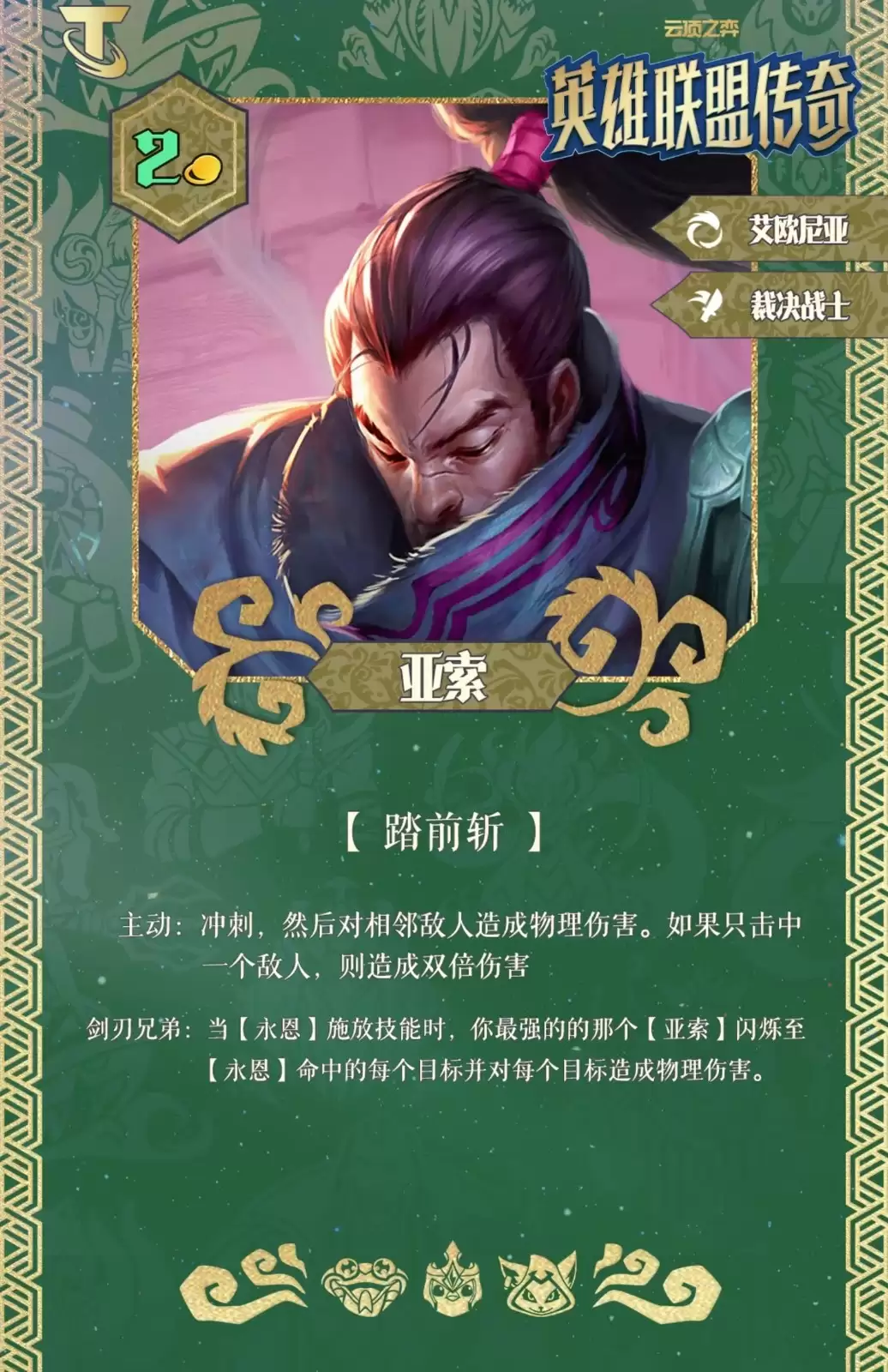 剑刃兄弟:当【永恩】释放技能时,你场上最强的【亚索】会闪烁至【永恩】命中的每个目标身旁,并对每个目标造成物理伤害。