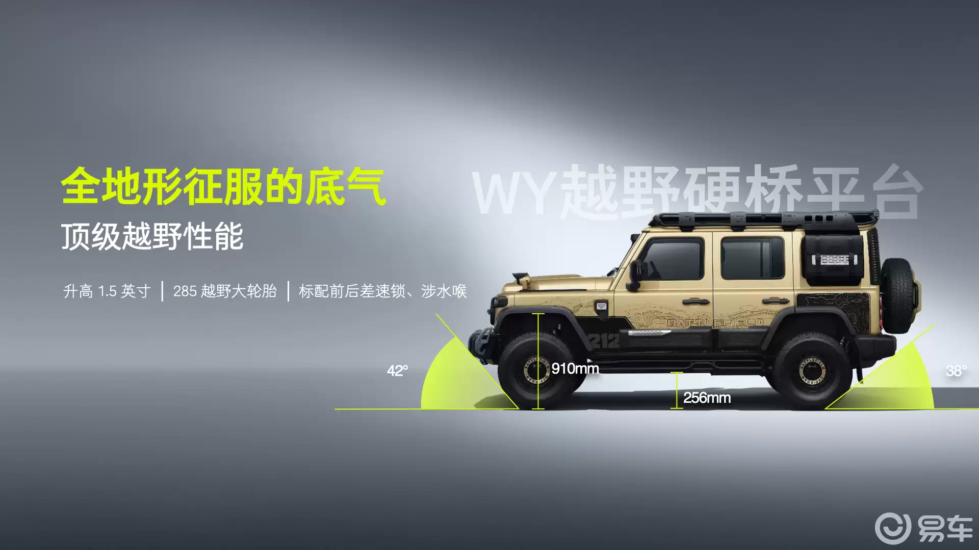 在越野性能方面,T01高地基于专业WY越野硬桥平台打造,非承载式车身与前后硬桥结构,车身升高1.5英寸,匹配285/70 R17越野大轮胎,标配前后差速锁与涉水喉,实现同级领先的42°接近角、38°离去角、910mm涉水深度以及256mm离地间隙。安全方面,T01高地构建了全方位防护体系,车身外覆盖区域采用双面镀锌板,防翻滚笼式车身结构和高强度钢的应用比例达到了71%,确保整车的碰撞安全。该车型还提供了10种驾驶模式,可轻松应对沙地、泥地、雪地、凹凸路等全地形路况,并历经366项严苛性能测试和超百万公里路试,确保其在各种极端环境下的可靠性与耐久性。