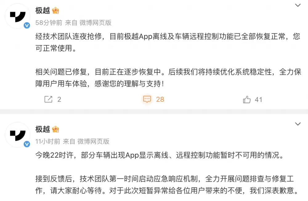 随后在24日上午9时左右,极越汽车方面再次发布声明称,经技术团队连夜抢修,目前极越App离线及车辆远程控制功能已全面恢复,可正常使用。“相关问题已修复,后续我们将持续优化系统稳定性,全力保障用户用车体验。”