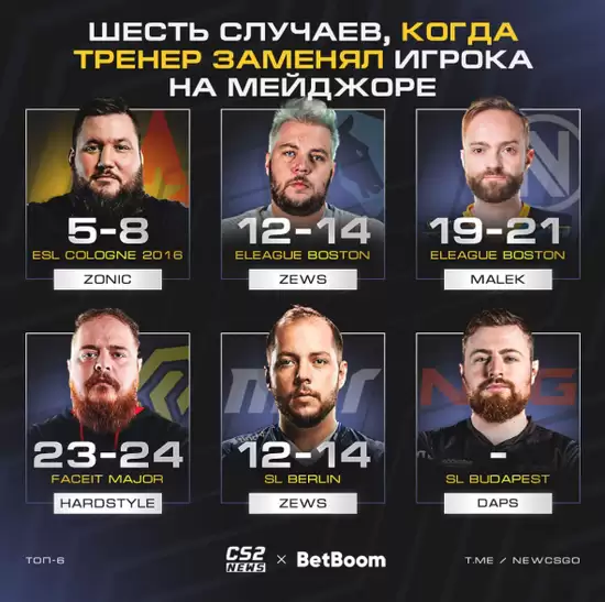 在Valve主办的Major赛事历史上,此前已有五位教练因突发情况临危受命,作为替补选手登场参赛,而美国教练daps将成为第六人。以下是历史上五起教练替补出战的经典案例回顾。
