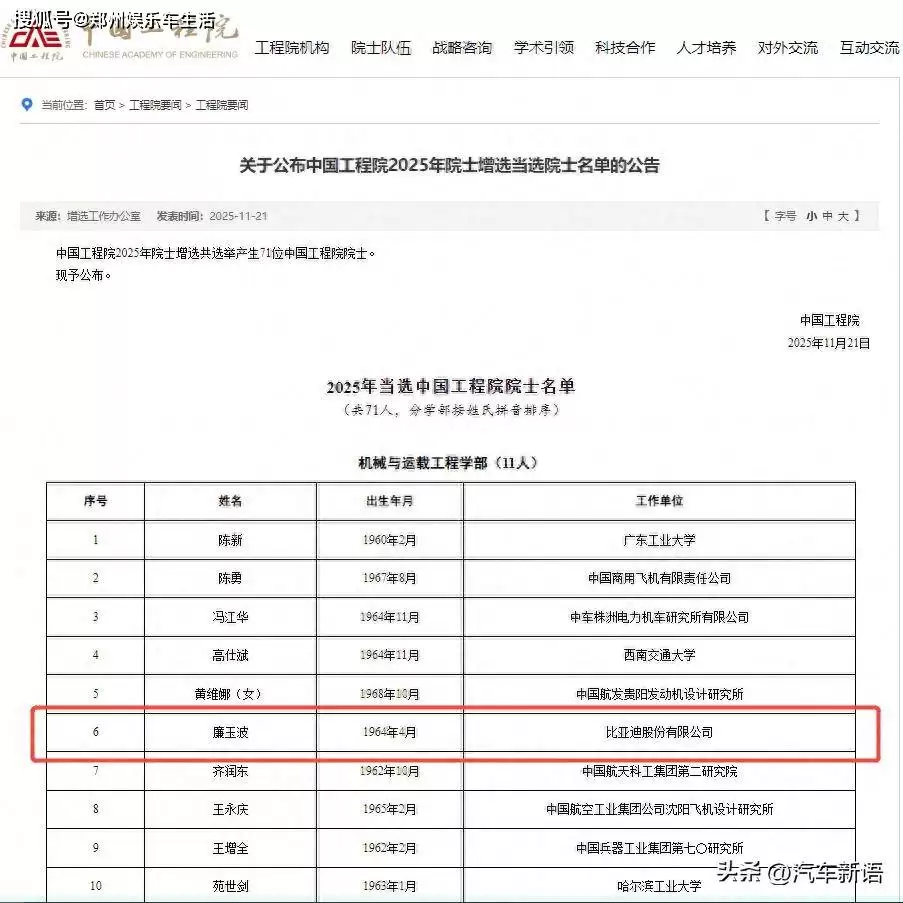 中国工程学院近日公布了最新一批院士增选名单,比亚迪集团首席科学家廉玉波凭借在新能源车领域的突出贡献成功当选。这一殊荣不仅是对他个人科研成就的高度认可,更彰显出我国工程科技界对新能源汽车技术创新的重视程度。