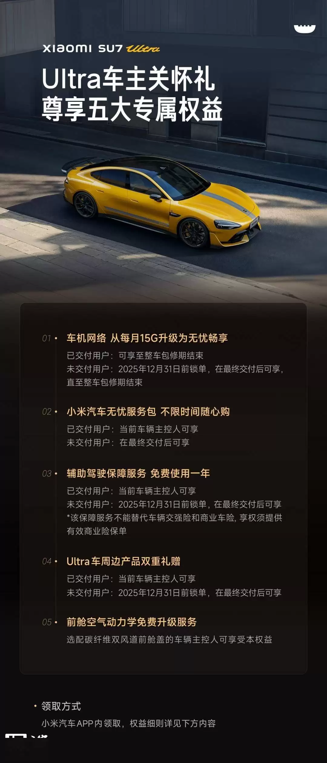 小米汽车近日为SU7 Ultra车主推出了一系列关怀举措,并针对相关权益细节进行了公开说明。此次公布的权益调整主要涉及车载网络服务升级、无忧服务包购买规则优化,以及新增辅助驾驶保障服务等内容,旨在提升用户用车体验的同时完善其服务保障体系。