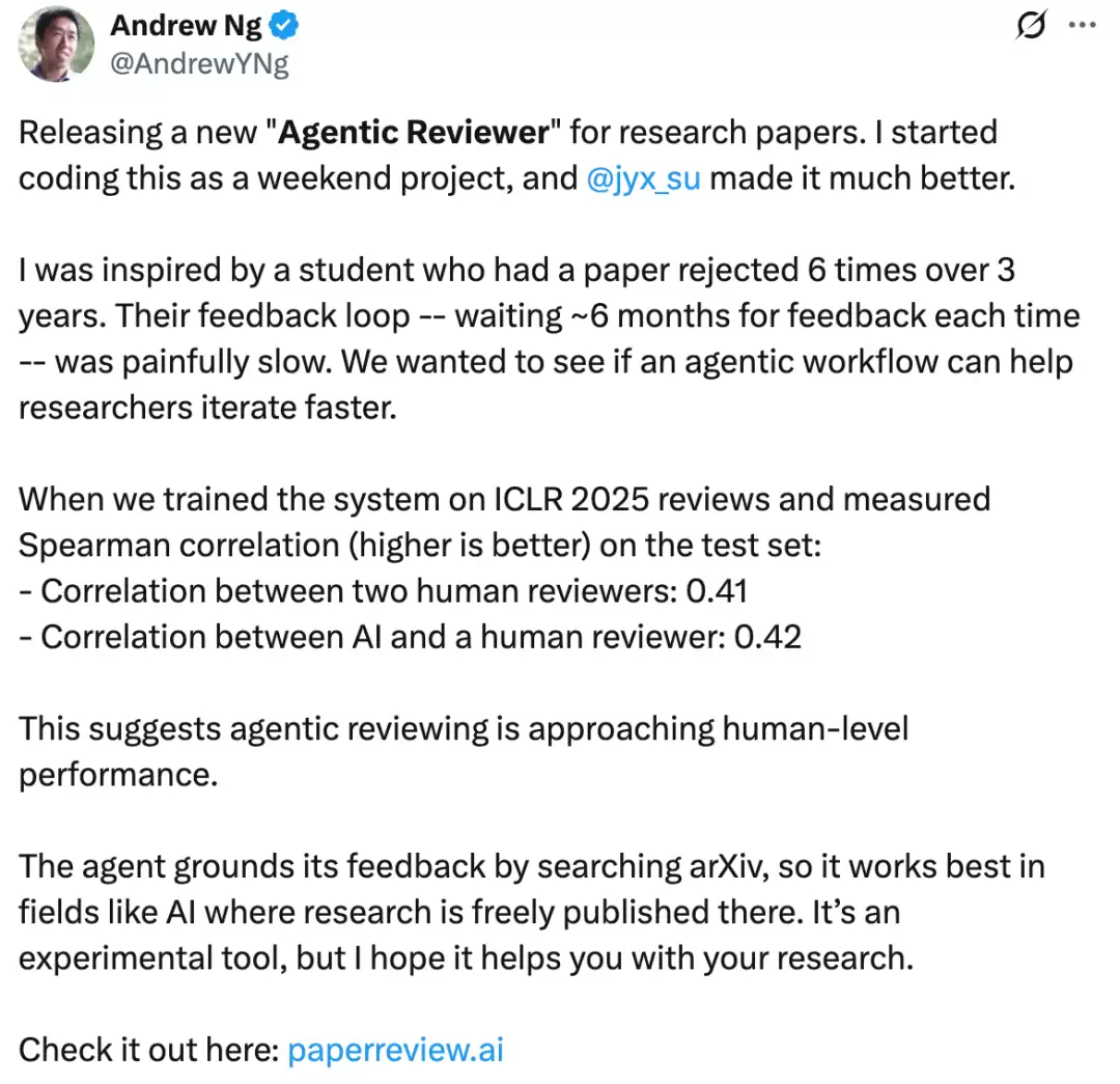 吴恩达教授最新发布了一款专为学术论文设计的"Agentic Reviewer(智能体审稿人)"。