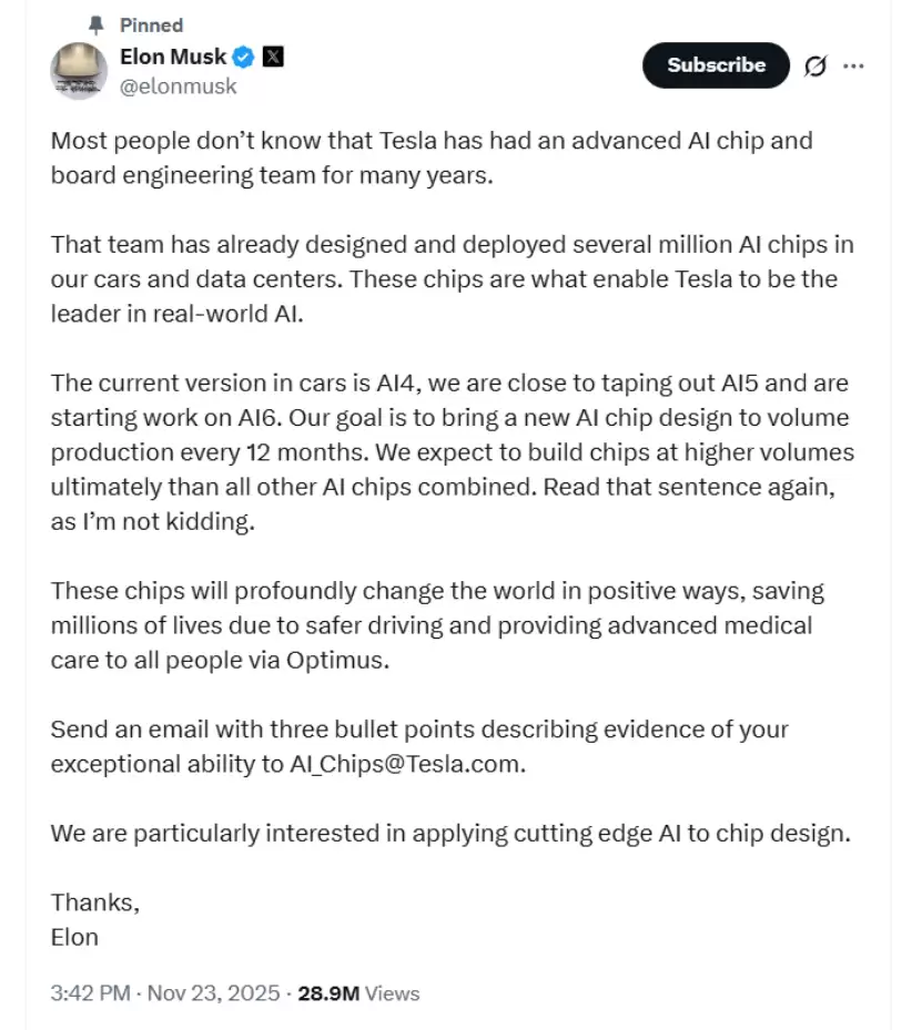 马斯克:特斯拉AI5芯片设计尾声,AI6研发同步启动