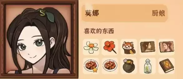 喜欢的物品:营养胡萝卜肉(烹饪)、营养胡萝卜肉★(烹饪)、莫娜肖像★(在野马湖画架绘制肖像画,需头脑+魅力≥50且莫娜在野马湖时)、莫娜肖像★★★★(在野马湖画架绘制肖像画,需头脑+魅力>50且莫娜在野马湖时)、芬芳的花蜜(完成冥滩极其艳丽的花丛事件)、催眠药水(秋火年炼金房获得)、《座位设置范例100例》(春火年故事角获取)