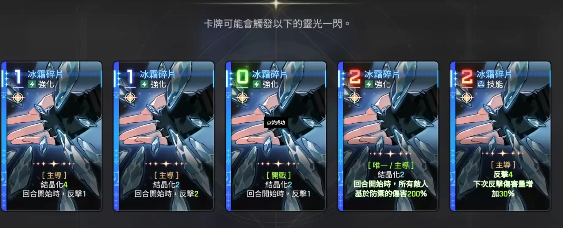 一技能"冰霜碎片"配合灵光一闪效果,将为玩家提供五张可选卡牌:首张卡牌提供4点结晶化并在回合开始时获得1次反击;次张卡牌可结晶化2点,回合开始获得2次反击;第三张卡牌拥有2点结晶化,回合开始反击1次;第四张卡牌在结晶化2点的同时,能使所有敌人的基础防御伤害提升200%;最后一张卡牌则提供4次反击,且下次反击伤害直接提升30%。