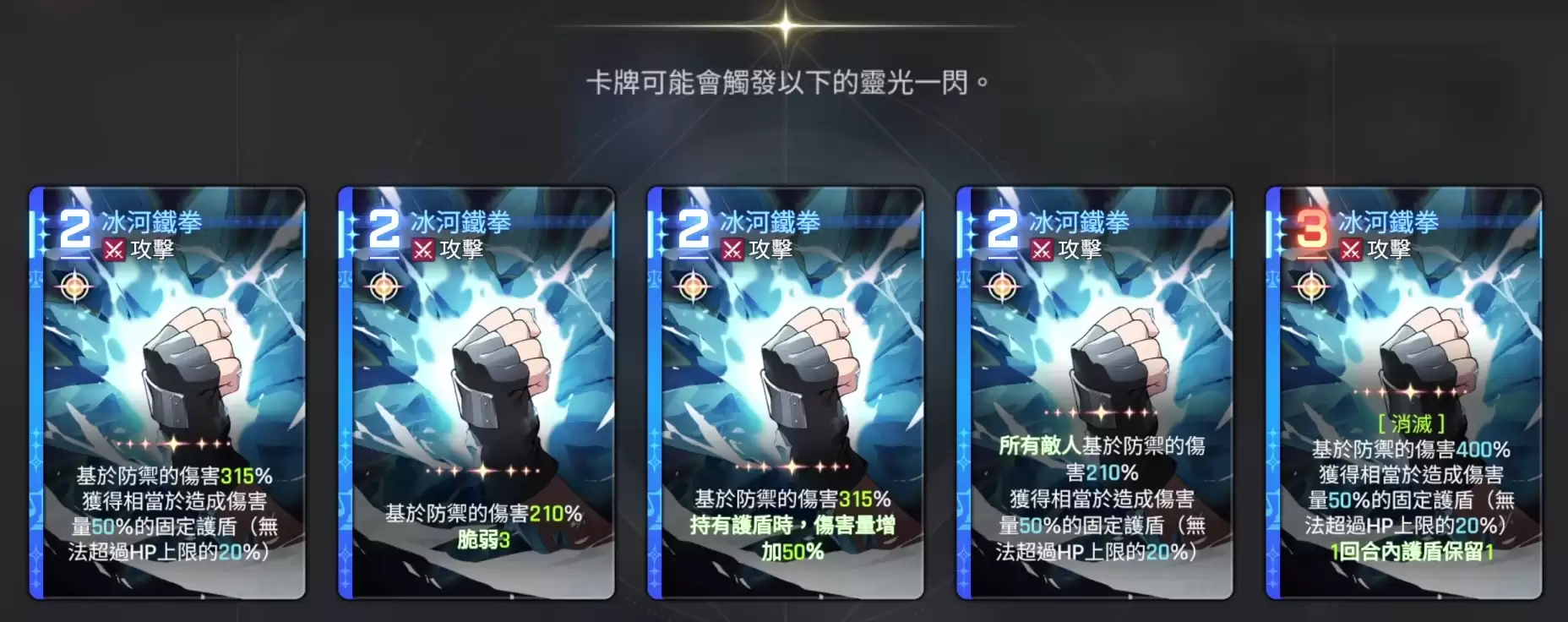 二技能"冰河铁拳"基础伤害达120%,攻击后可获得伤害值50%的护盾,但护盾量不超过生命上限的20%。结合灵光一闪效果:首张卡牌将基础伤害提升至315%;第二张卡牌基于防御伤害的200%;第三张卡牌在拥有315%基础伤害的同时,持有护盾时伤害再增50%;第四张卡牌调整为对所有敌人造成伤害;最终卡牌不仅将基础防御伤害倍率提升至400%,还能使护盾效果持续保留整回合。