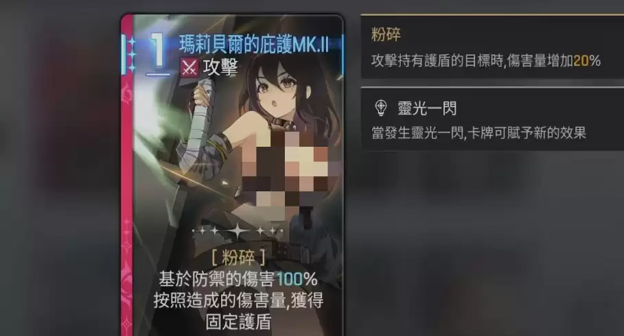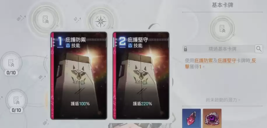 他的初始卡组包含四张基础卡牌,分别是“庇护防御”、“庇护坚守”、“意志冲击”和“庇护飞踢”。其中攻击卡牌“庇护飞踢”能根据当前防御值提升伤害量,而“意志冲击”不仅能对敌方造成基于防御值的伤害,还能为目标附加一层反击状态。“庇护防御”属于技能卡,使用后可以简单直接地获得护盾,而“庇护坚守”虽然需要消耗两费,但它提供的防御值比普通防御技能更高,可见玛丽贝尔在防守反击方面确实具有独特优势。