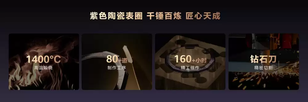 表圈作为腕表的视觉焦点,华为紫金款实现了突破性创新——首次采用复合稀土创新配方,历经高强干压、湿压及1400℃高温釉炼,最终铸造出深邃雅致的紫色陶瓷表圈,彻底打破行业对陶瓷色彩的想象边界。十二边形的表圈轮廊经由微米级星钻切割工艺雕琢而成,棱角分明却不失温润质感;六边18K黄金金条由大师纯手工镶嵌其上,与紫色陶瓷形成经典的紫金碰撞,成就业界首款将彩陶与黄金共辉于一处的高端智能腕表表圈。表圈字符采用皮秒级激光镌雕技术,间距、大小与深度经过反复校准,配合24K镀金处理,在任何光线条件下都清晰可读,更添明亮光泽。紫金交汇之间,内敛的高贵与工艺的锋芒尽显。