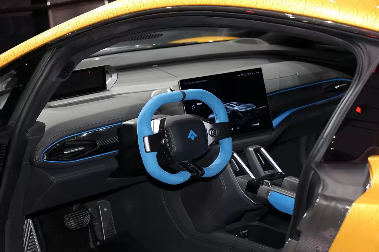 内饰方面,昊铂SSR云纹金高定版采用了简约科技风格。车内配备8.88英寸液晶仪表盘与14.6英寸悬浮式中控屏,信息显示清晰且操作便捷。方向盘采用六边形赛车风格设计,并加入碳纤维材质点缀,握感舒适且极具运动感。换挡机构则采用了拨杆式设计,操作起来更加精准迅捷。车内更选用欧洲高端定制真皮材质,进一步提升了座舱的豪华质感。
