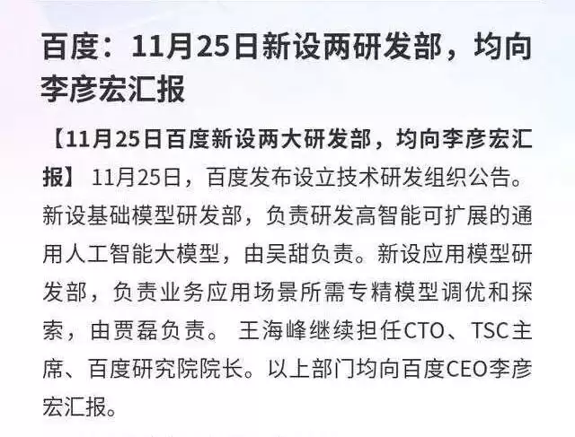 2025年11月25日,百度发布了一则技术研发架构调整公告,透露出公司AI战略迎来深层变革:新设立的基础模型研发部与应用模型研发部将直接向CEO李彦宏汇报,而身为集团CTO的王海峰则被排除在这次大模型核心研发管理范围之外,职权显著收缩。这一调整背后,反映了李彦宏对百度AI业务“技术有积累、市场无响动”现状的不满,作为技术体系最高负责人,王海峰自然难辞其咎。