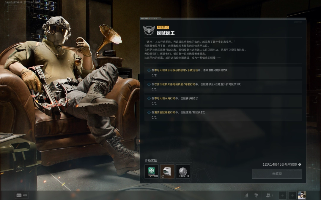 任务地图: 零号大坝(机密)、零号大坝(永夜)、零号大坝(水淹)、长弓溪谷(机密)、航天基地(机密)、航天基地(绝密)、巴克什(机密)、巴克什(绝密)、潮汐监狱(绝密)