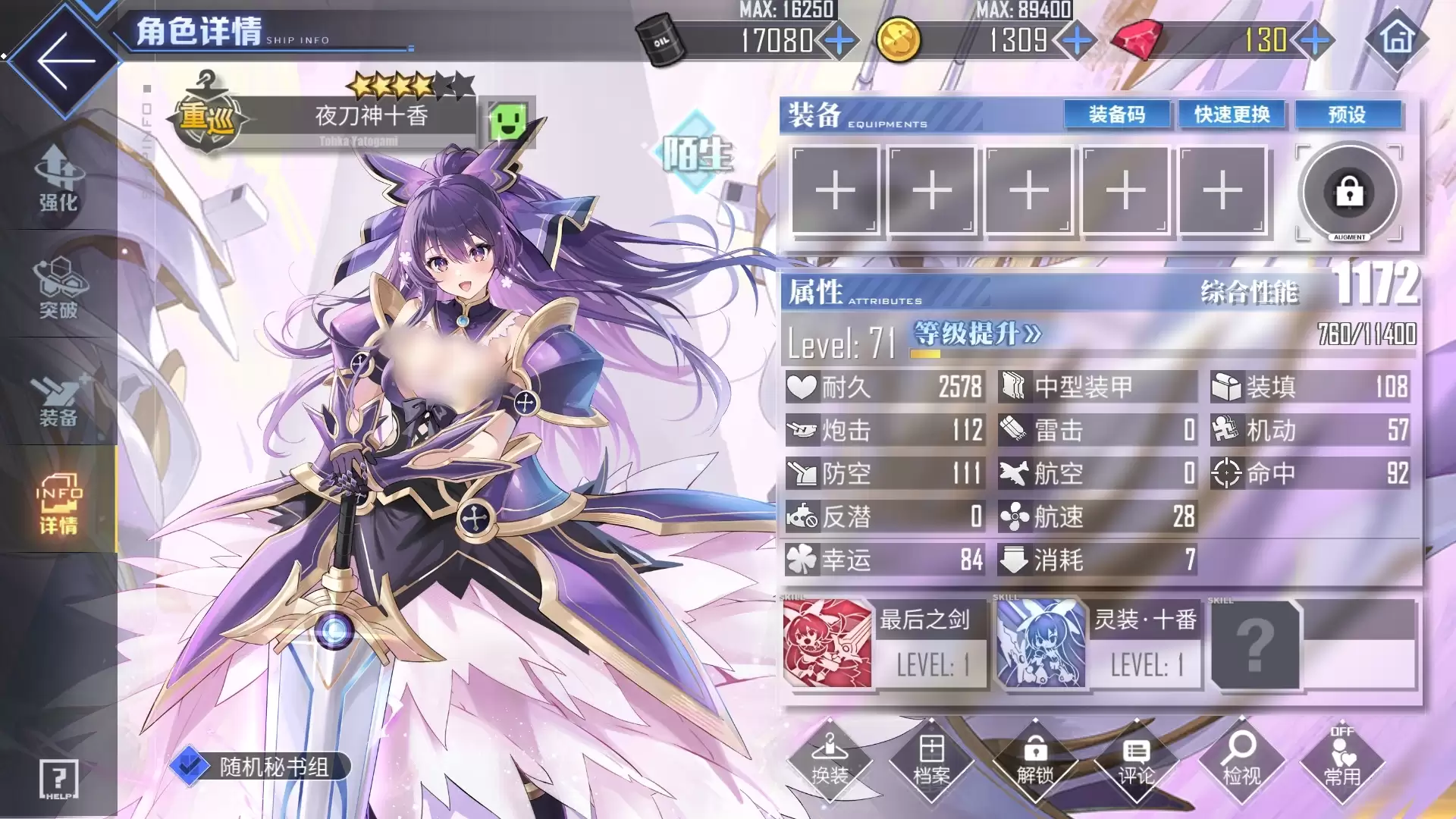 此外,夜刀神十香的专属兵装"鏖杀公"还能让她永久获得伤害降低8%的效果,并且每当她击毁一艘敌舰后,还能为自己增加8%的暴击率。此效果最高可叠加三层,一旦获得就能持续到战斗结束,中途不会失去任何已叠加的层数。在舰娘装备搭配方面,常规的彩重巡炮夜刀神十香都可携带。如果没有彩炮的话,为她装备欧根炮或巴尔的摩炮也是不错的选择,副炮栏位使用每月可兑换一次的B13即可,也可使用金128,防空炮则选用最泛用的金113。两个设备栏位以传统重巡配置为主,金舵机加维修工具的组合能帮助夜刀神十香应对大部分作战环境。
