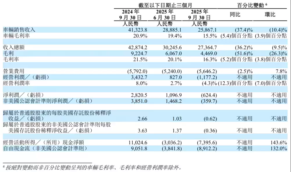 11月26日,理想汽车公布了截至2025年9月30日的季度未经审计财务业绩。财报数据显示,2025年第三季度车辆销售收入为259亿元人民币(约合36亿美元),较2024年同期的413亿元下降37.4%,较2025年第二季度的289亿元环比减少10.4%。