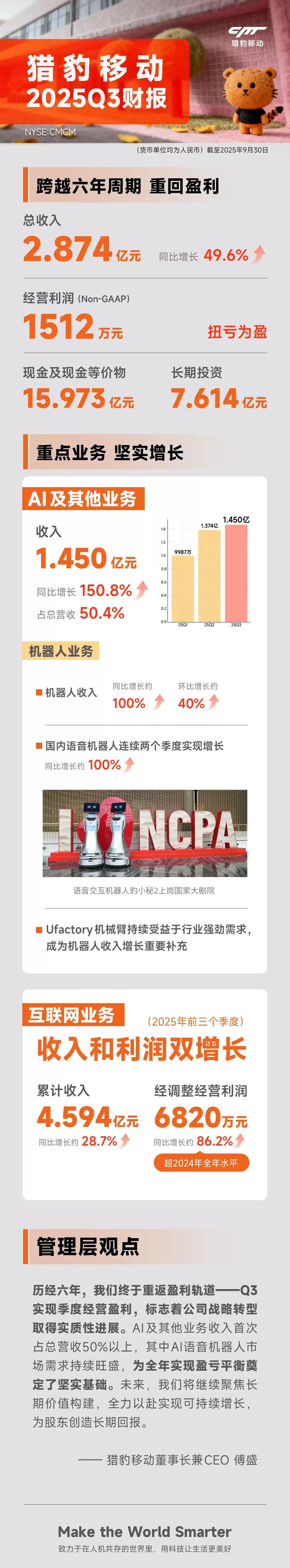 猎豹移动董事长兼首席执行官傅盛表示:“历经六年的持续努力,我们终于重回盈利轨道,标志着公司在战略转型方面取得了实质性进展。目前AI及其他业务收入已占总营收的50%以上,其中AI语音机器人市场需求持续旺盛,为公司全年实现盈亏平衡奠定了坚实基础。”
