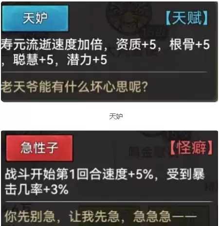 我们之所以选用【画师】,主要是因为她天生拥有较高的速度属性,能够帮助我们在PVP对局中抢占先机。因此,在挑选画师弟子时,首先需要关注的是那些能够提升速度的【词条】,例如【急公好义】、【杠精】、【急性子】、【胆小】等。除此之外,还有两个比较特殊的速度【词条】值得留意:【提笔有神】和【天媚】。【提笔有神】要求主角佩戴【笔】类武器才能激活5%的速度加成,而我们通常佩戴【扇】类武器所提供的速度增益远高于此,所以一般不会考虑这个选项;至于【天媚】,它会为队友提供5点潜力加成,而潜力又会直接影响弟子的各项属性——包括速度,因此我们可以将【天媚】视为半个速度【词条】。