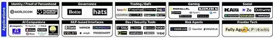 虽然在构建这些基础基础设施原语方面已经取得了一些进展,但生产就绪的、链上的大型语言模型和AI智能体仍然处于起步阶段,并且我们预计在计算、数据和模型基础设施成熟之前,这种情况不会改变。尽管如此,我们认为这个类别非常有前景,是该领域投资策略的核心焦点,这是由对AI服务长期的隐含增长和需求所驱动的。在该层构建的新兴领域和示例项目包括以下几个: