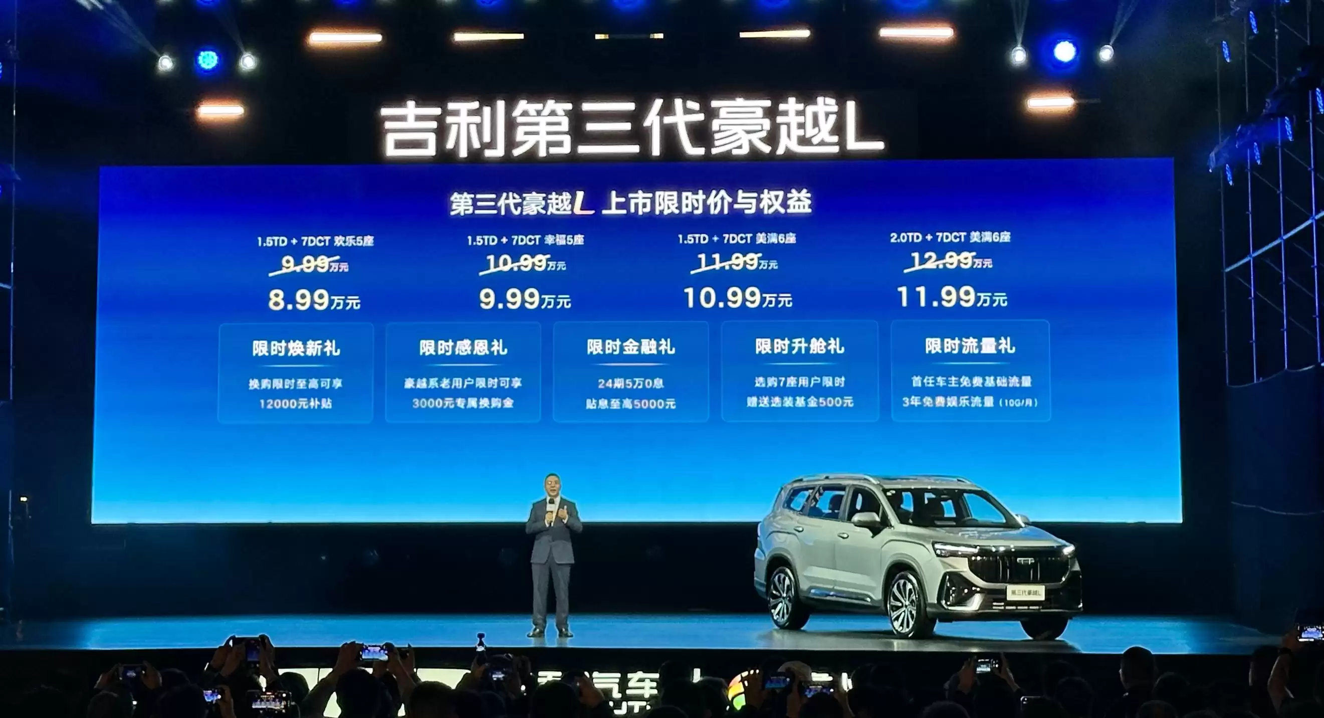 吉利汽车旗下星家族的最新成员——第三代豪越L正式上市,作为品牌唯一的B级燃油SUV,此次共推出4款配置车型,官方指导价区间为9.99万元至12.99万元。即日起至12月31日,用户下订可享“1000元订金抵11000元购车款”的限时补贴政策,实际购车门槛下探至8.99万-11.99万元。厂家同步推出多重购车礼遇,包含最高12000元置换补贴、豪越老车主专属3000元增购礼金、24期5万0息金融方案(贴息至高5000元)、7座车型500元选装基金,以及首任车主终身免费基础流量和3年每月10G娱乐流量。
