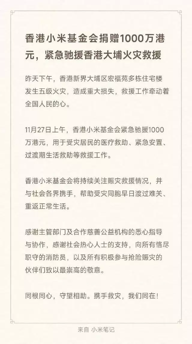 小米基金会捐赠千万港元,支援香港大埔火灾救援