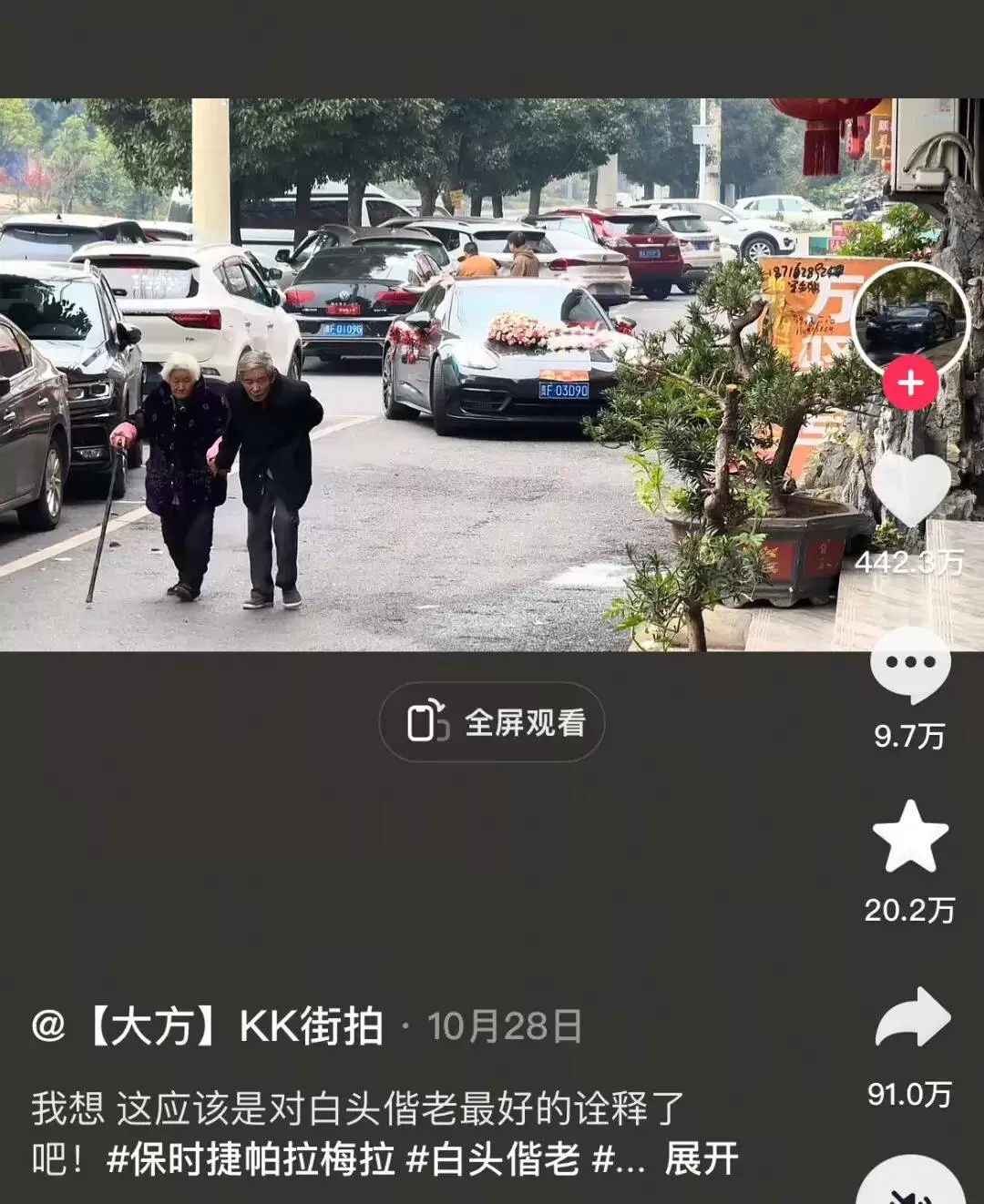 近期一则婚车视频引发热议:当保时捷Panamera作为头车行驶时,前方恰好出现一位白发老人,构成“白首偕老”的温馨画面。保时捷官方随即以“何其有幸,与爱同行”作出回应,短短八字将产品自然融入幸福场景,既升华了品牌角色,又唤起人们对美好爱情的遐想。这种不喧宾夺主的谦逊姿态,让品牌的温情形象直抵人心。