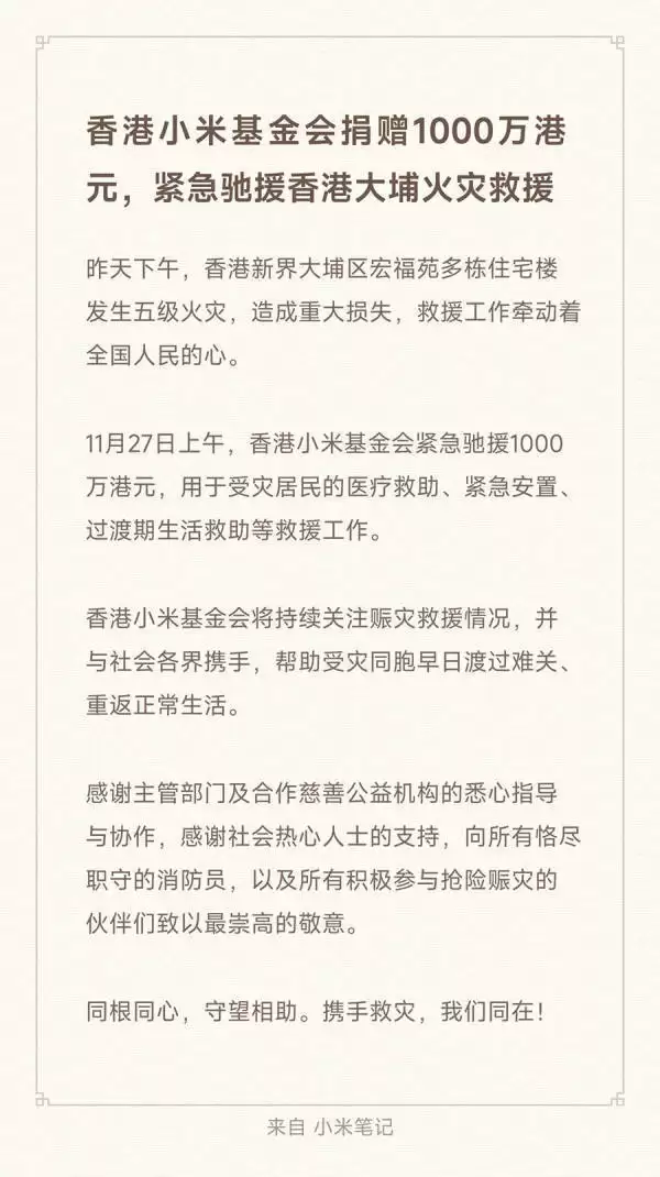 小米雷军微博宣布:香港基金会捐千万港元救助大埔火灾灾民