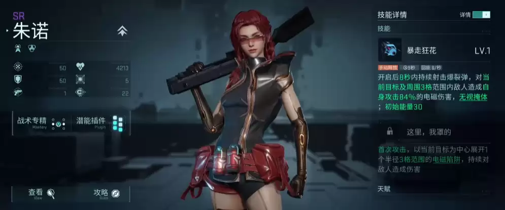 当然,目前对于突击角色来说,掌握了伤害提升后的专机能力,可以为朱诺带来足够的拆迁效果。目前朱诺自身的技能效果上,主要用到的一个技能是暴走狂花,这个技能效果主要是在开启了之后,8秒时间之内可以进行持续的射击,射击带来的子弹都是爆破弹的输出效果,对当前攻击选中的目标以及周围三格之内的敌人,其实造成的都是范围类型的伤害。在输出上面,根据自身攻击数值84%的电子伤害继续输出的话,这里带来的能量消耗比较大,但是输出数值叠加起来是非常厉害的。
