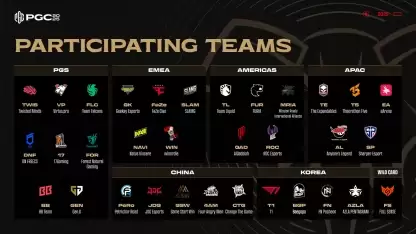本次参战的33支战队,主要为32支通过PGS积分+1只主办赛区的“外卡”战队组合而成。33支战队将分成A组和B组进行角逐,并根据之前PGS和区域系列赛的结果,采用蛇形排列的方式确定,其中外卡战队为:AZLA PENTAGRAM。