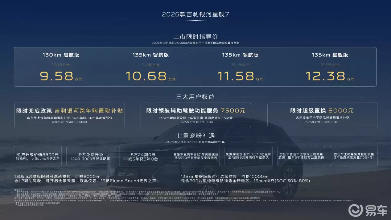 在新能源电混SUV市场,一款颇具竞争力的车型——2026款吉利银河星舰7EM-i正式亮相。这款车凭借在电池技术、续航表现、智能配置、安全保障和乘坐舒适性五大核心维度的全面提升,迅速引发市场广泛关注。作为基于GEA新能源专属架构打造的首款电混SUV,全系推出四个版本:130km启航版、135km智航版、135km领航版和135km星舰版,官方指导价区间为9.58万至12.38万元。即日起,用户可通过吉利银河官方APP、微信小程序、抖音小程序及授权经销商等渠道预订,还能享受多重限时购车权益与专属礼遇。
