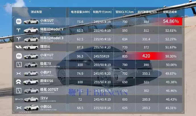 在这样高强度的测试环境下,小米汽车旗下的两款车型表现尤为抢眼。其中小米YU7凭借卓越的续航能力脱颖而出,最终续航里程达到了420公里,在所有参测车辆中续航表现最优。而小米SU7则在续航达成率方面表现突出,其54.86%的达成率使其成为测试中能耗效率最高的车型。