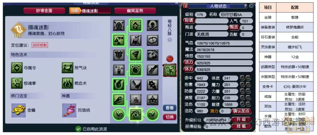 1、封印无底洞装备套装:修罗傀儡妖灵饰属性:6速度,6法防实战分析:由于无底洞拥有师门技能【秘影迷踪】,可以获得不亚于女儿村的速度属性。再搭配神器技能【相思】,每回合结束时增加3点速度,在全敏加点下可以取得全场1速,实现彻底的控场。